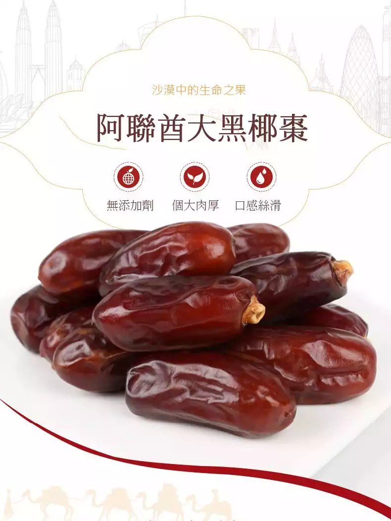 阿聯酋當地的黑椰棗不僅營養豐富,更有著極高藥用價值,對糖尿病、血糖异常、膽固醇异常、關節疼痛,包括對高血壓、高血脂,甚至是癌症都起到一定的作用。