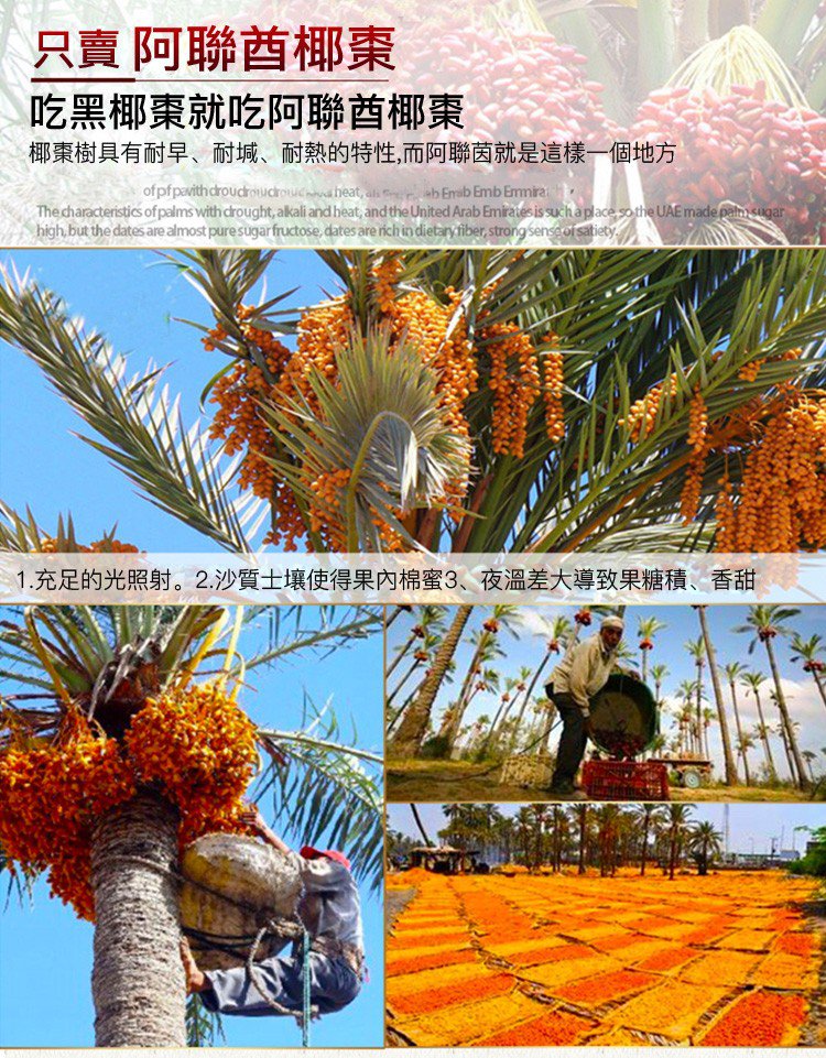 阿聯酋當地的黑椰棗不僅營養豐富,更有著極高藥用價值,對糖尿病、血糖异常、膽固醇异常、關節疼痛,包括對高血壓、高血脂,甚至是癌症都起到一定的作用。